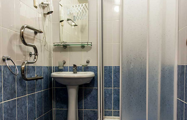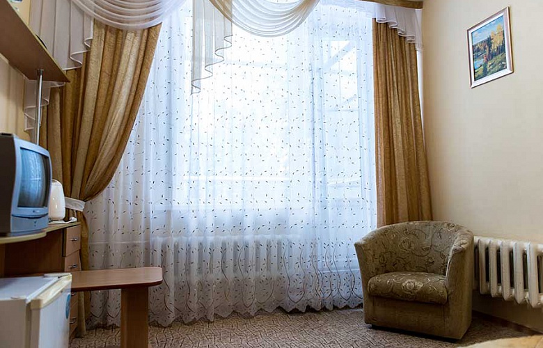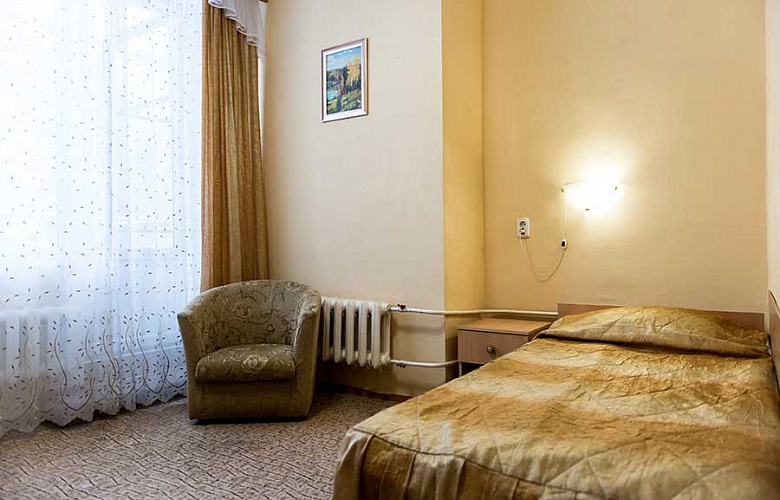 1 осн. место. Мебель: кровать односпальная, прикроватная тумбочка, столик журнальный, стул, шкаф. Оборудование: мини-холодильник, набор посуды, телевизор, электрочайник. Санузел: с душевой кабиной, туалетные принадлежности, фен. Сервис: смена полотенец, смена постельного белья, уборка номера.